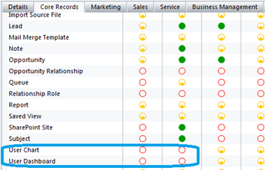 - Open security role –> Core Records tab, set ‘User Chart/User Dashboard’ access level to ‘none’