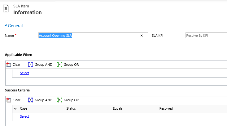 - Added a new ‘SLA Item’ with no ‘Applicable When’ criteria (i.e., SLA should kick in for all Case’s if no criteria given) and ‘Success Criteria’ as Case Status ‘Resolved’
