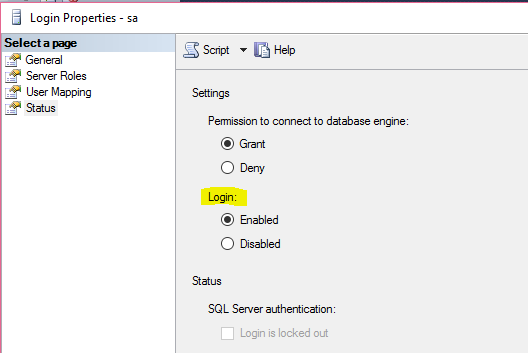 - ‘Login’ feature has to be enabled for ‘sa’ account