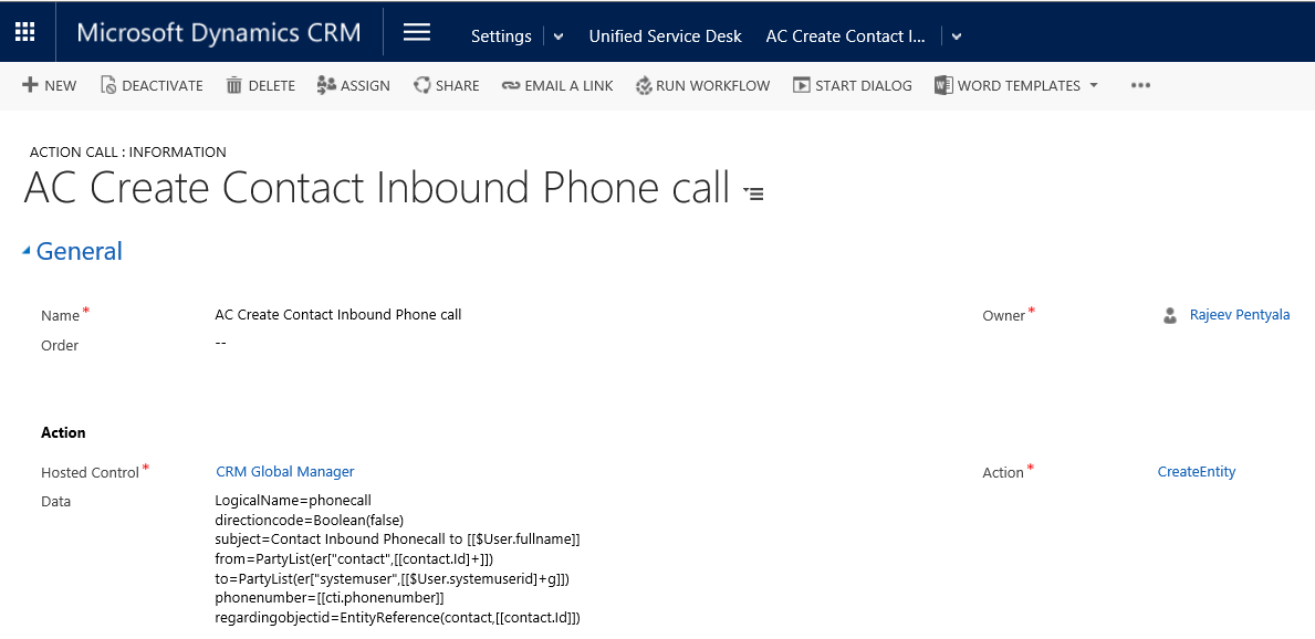 - Now coming back to our requirement, we need to create an “Incoming Phone Call” for the matched ‘Contact’, which got opened in USD.