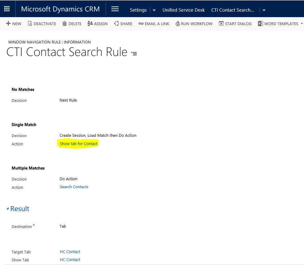 - In the Action Call “Show tab for Contact”, we set focus on ‘Contact’ which was opened in USD.