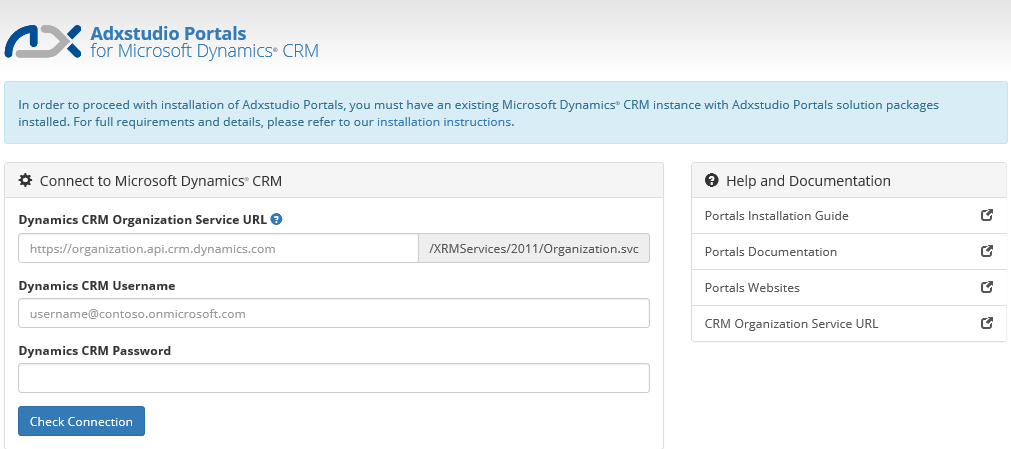 - When you run ADX portal for the first time, it opens Configuration screen to capture CRM organization credentials.
