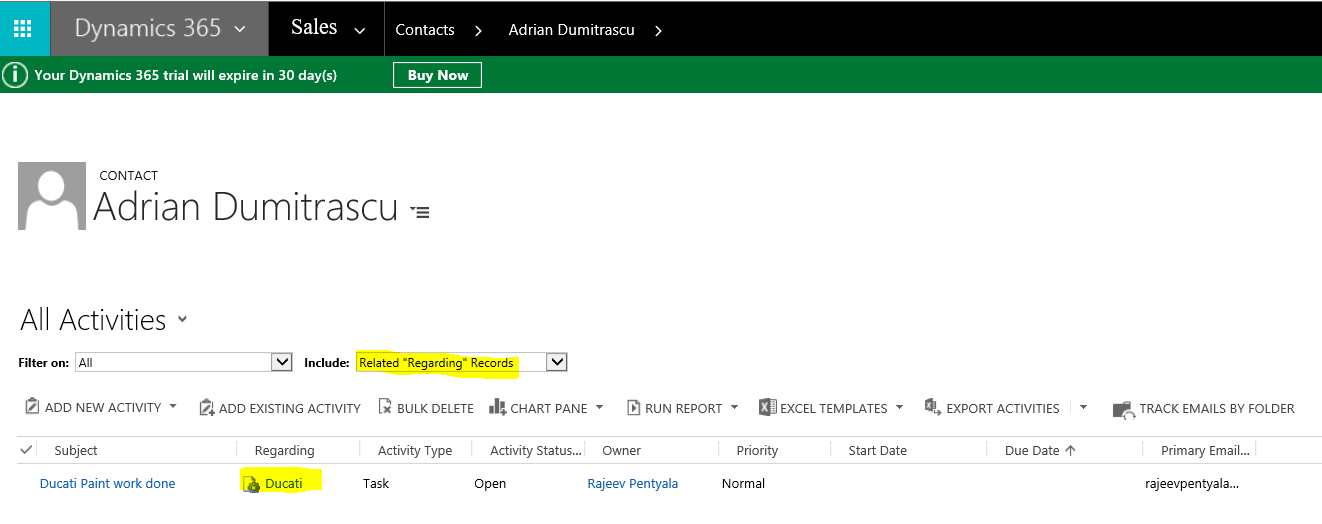- As I set the ‘Rollup View’ as ‘Cascade All’ between ‘Contact’ and ‘Bike’, I get the Bike’s Task activity under my Contact’s ‘Activity Associated View’.