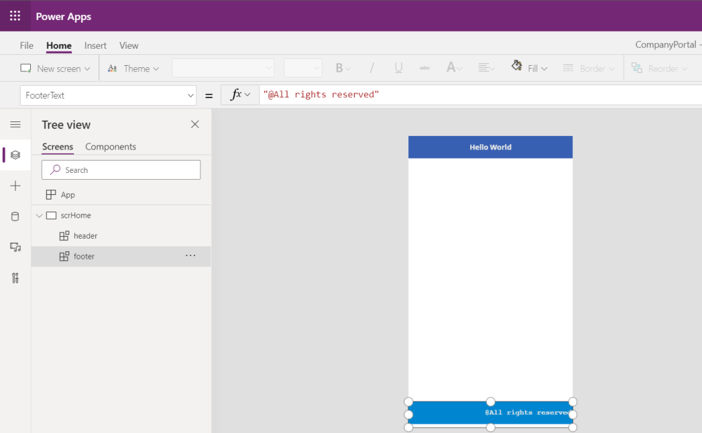 - Similarly, Set the ‘FooterText’ property of the ‘Footer’ component. This would immediately changes your Footer label text.