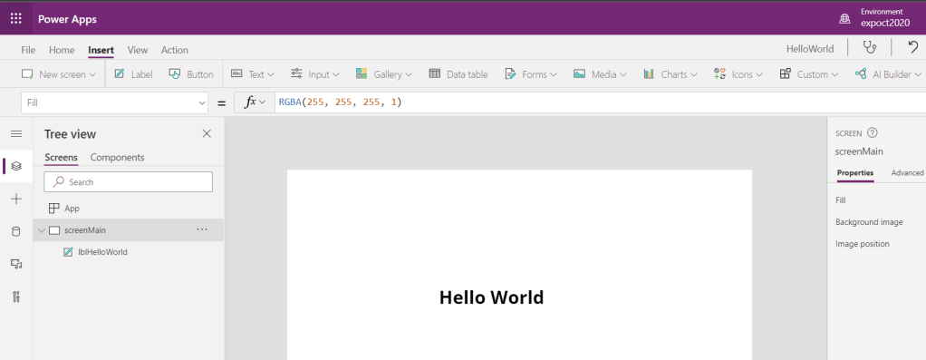 In my Power Apps Environment I have the following ‘Hello World’ Canvas App.