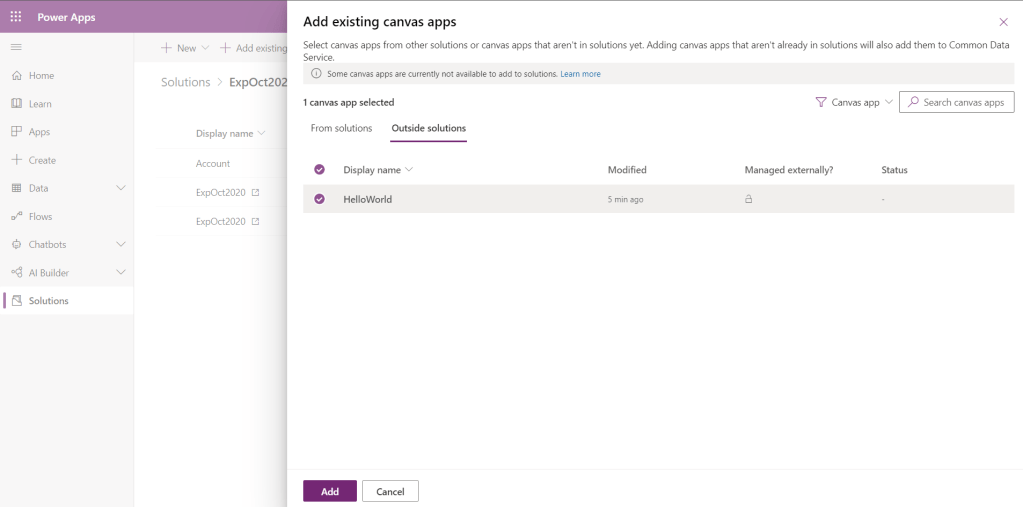 - Open any of the unmanaged solution from the Environment, use ‘Add Existing’ and select the ‘Hello World’ Canvas App from ‘Outside solutions’ tab.