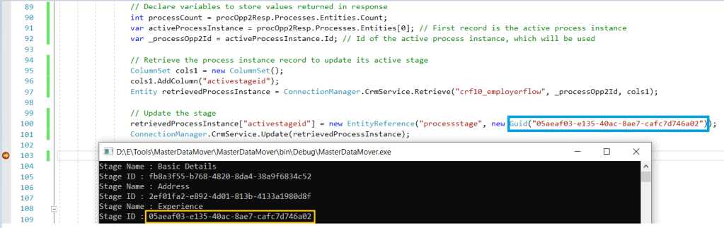 - Update ‘activestageid’ field of the ‘BPF entity’ (i.e., Employer Flow) record fetched in previous step, with the desired stage GUID captured in Step #2.