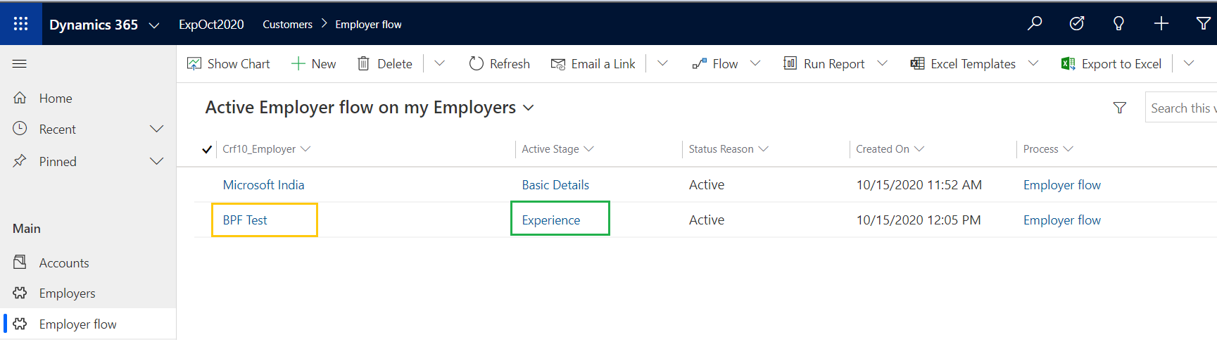 Following are the steps to create a ‘Employer’ record and set the BPF stage to ‘Experience’.