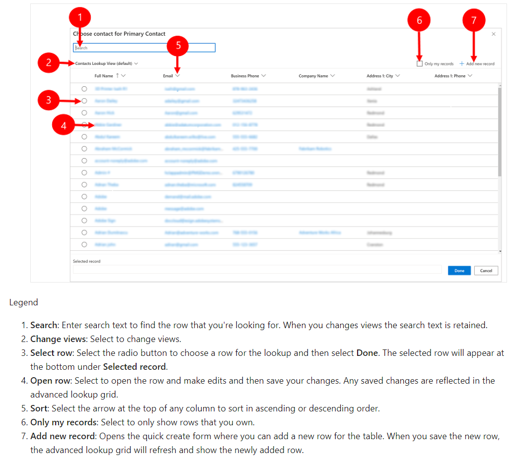 - Advanced lookup supports customizations on lookup control through Client APIs such as addCustomView, addCustomFilter, addPreSearch and removePreSearch.