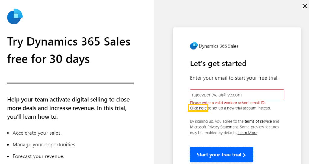 Up on clicking ‘Try for free’ its mandating us to enter “Either Work or school email ID”.