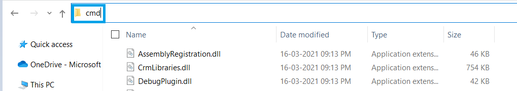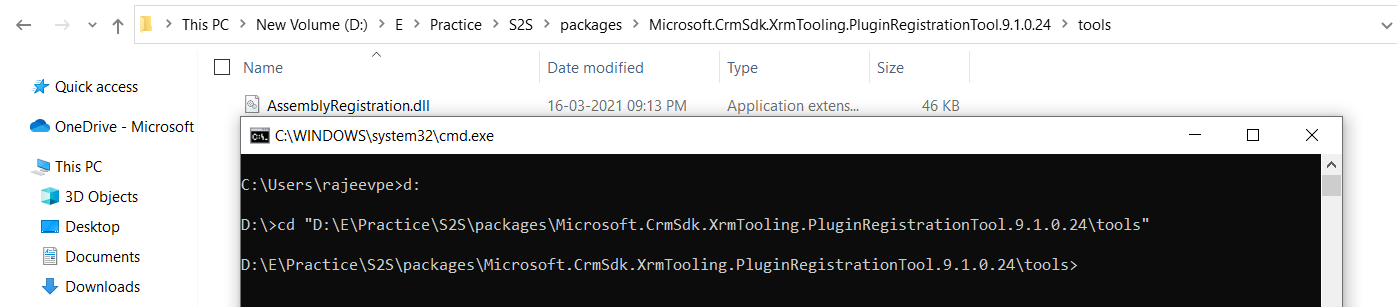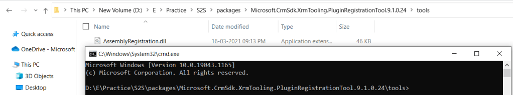 - Above example, I am pointing the Command Prompt to “D:\E\Practice\S2S\packages\Microsoft.CrmSdk.XrmTooling.PluginRegistrationTool.9.1.0.24\tools” folder using ‘cd’ command.
