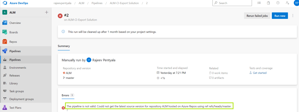 The pipeline is not valid. Could not get the latest source version for repository…