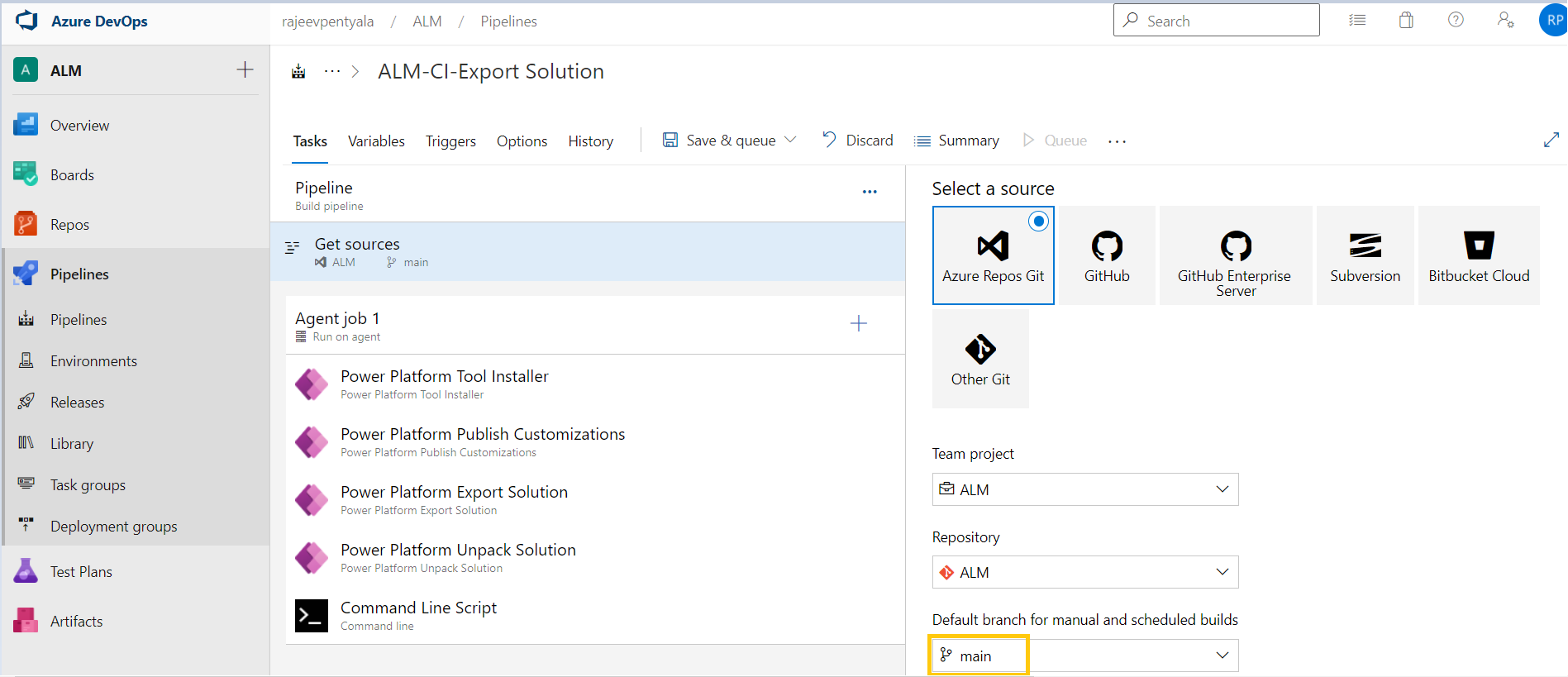 - In the ‘Get sources’ step of the pipeline, change the Default Branch from master to main.