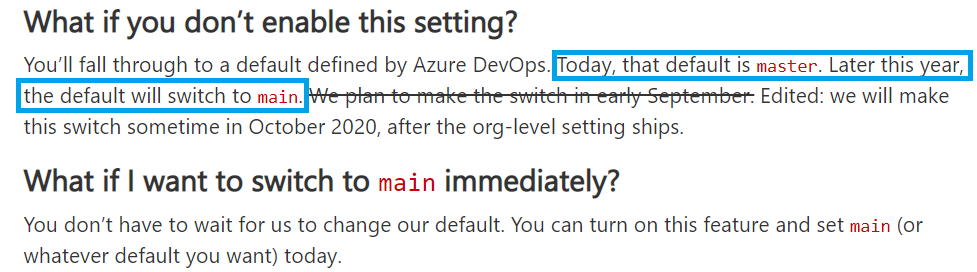 - In ADO, default ‘Branch Name’ used to be master until October 2020. Post that default ‘Branch Name’ changed to main.