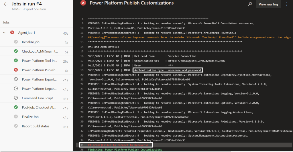 - Since the ‘Power Platform Publish Customizations’ task’s ‘Authentication type’ was selected as ‘Username/password’ which does not support MFA, pipeline could not connect to the Dataverse environment.