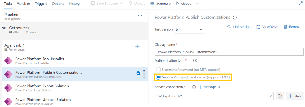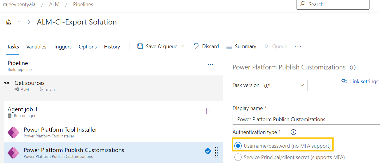 - ‘Power Platform Publish Customizations’ task’s ‘Authentication type’ was selected as ‘Username/password’ which does not have MFA support.