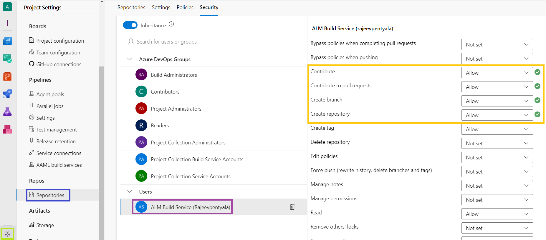 - Under ‘Security’ tab, select the ‘ALM Build Service(User_Name)‘ and grant highlighted privileges.