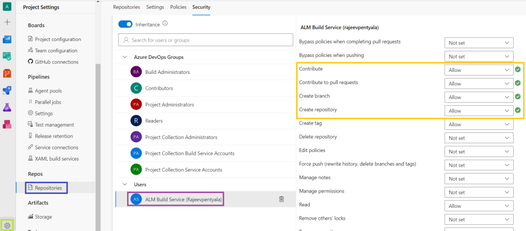 - Account under which the ADO pipeline running, does not have required permissions to Push the code.