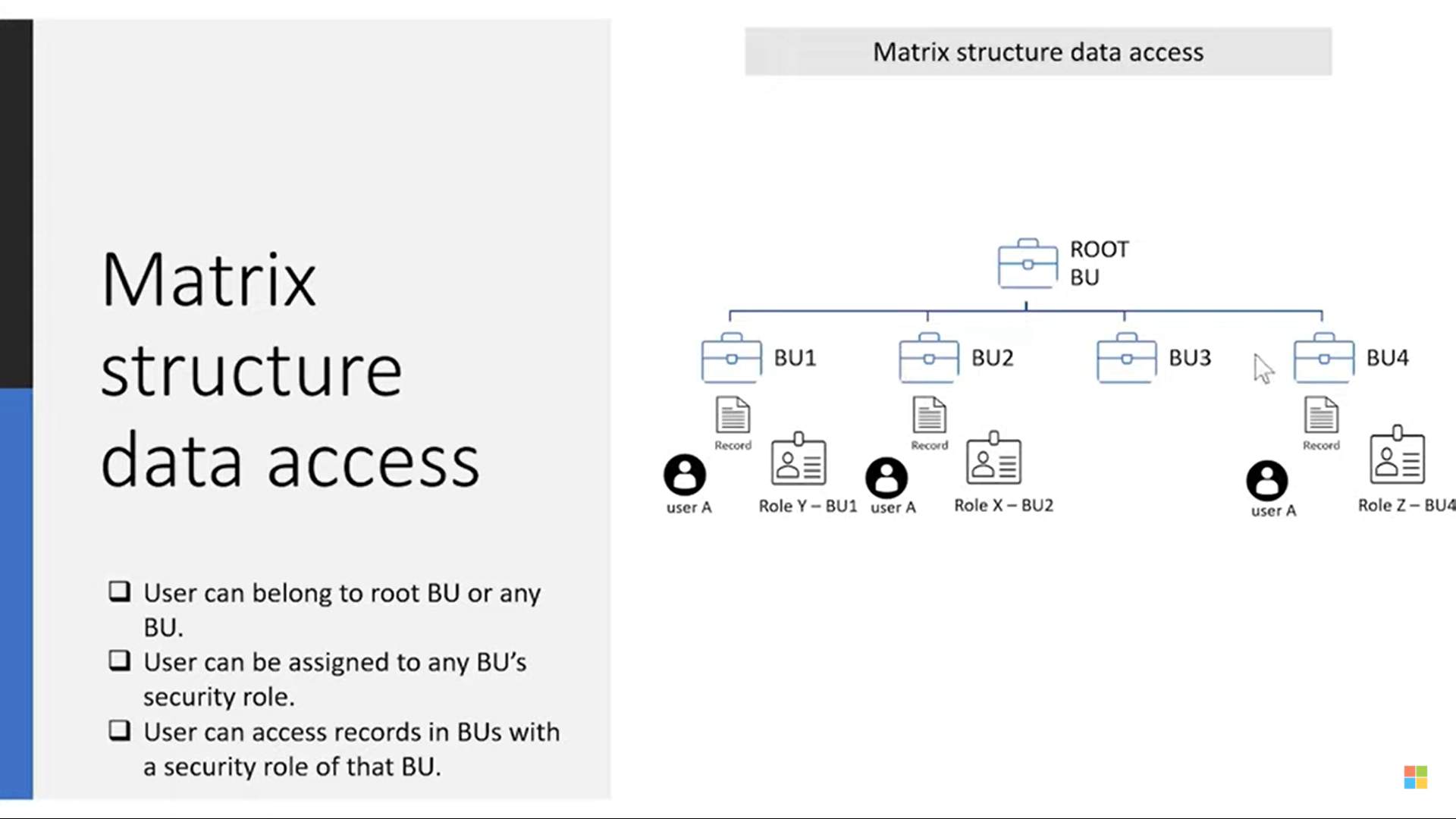 - Security roles from different business units can be assigned to the users regardless of the business unit the users belong to.