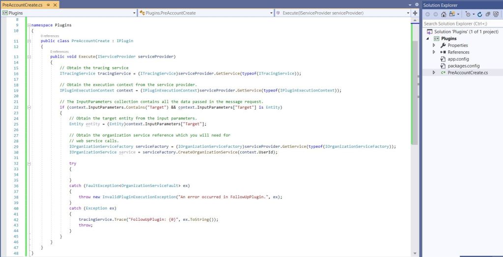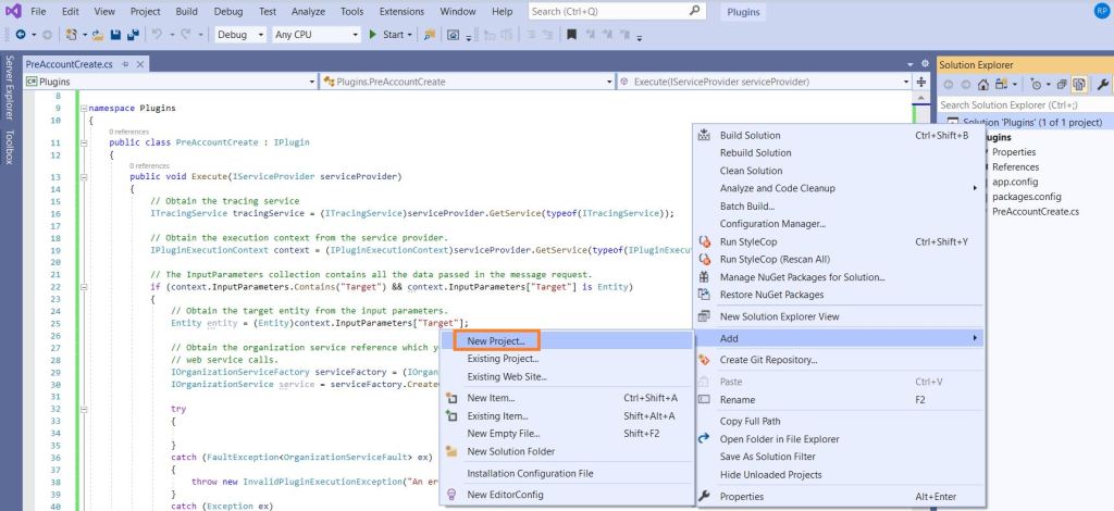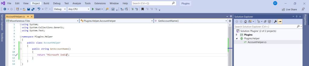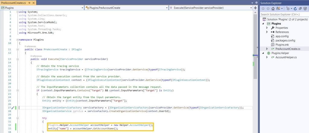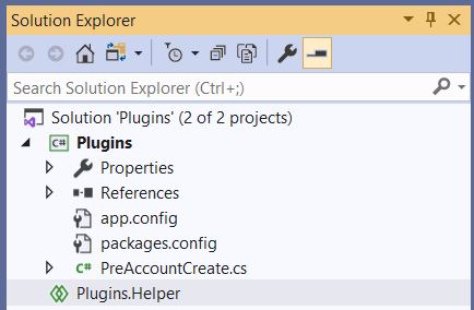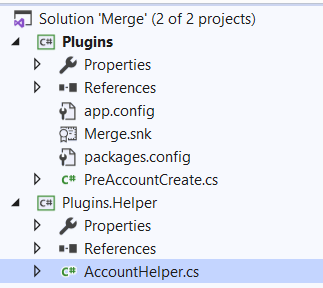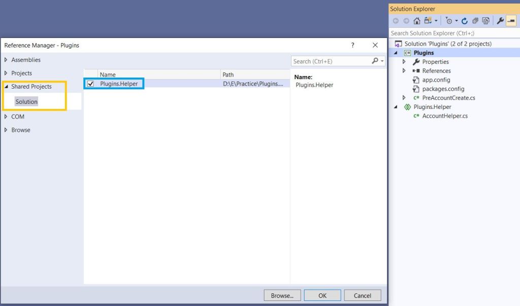 To explain the Shared Projects, I am going to build a simple Plugin project ‘Plugins.csproj’ with ‘PreAccountCreate’ class, which refers a ‘Shared’ Helper project ‘Plugins.Helper’.