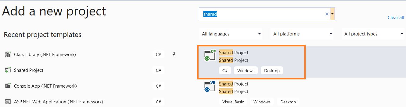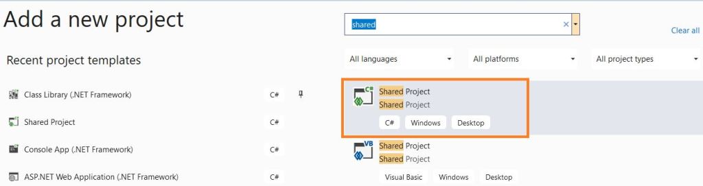 - Select a Project template of type C# ‘Shared Project’.