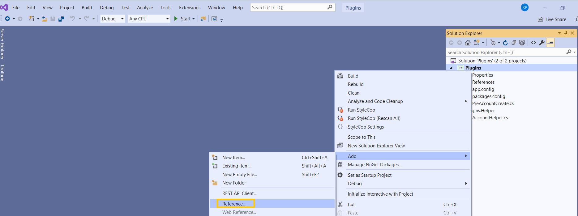 - To use the ‘Shared Project’ in our Plug-in project, right click ‘Plugins’ project and add ‘Reference’.
