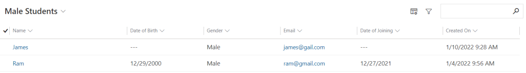 - As an example, below ‘Male Students’ view contain 2 records where Gender=Male.