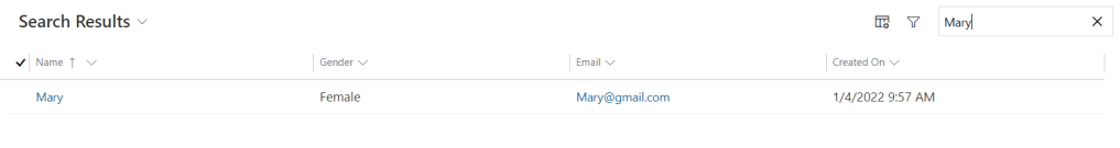 - If I search for a ‘Female’ record which is not part of this view, it will show up as below.