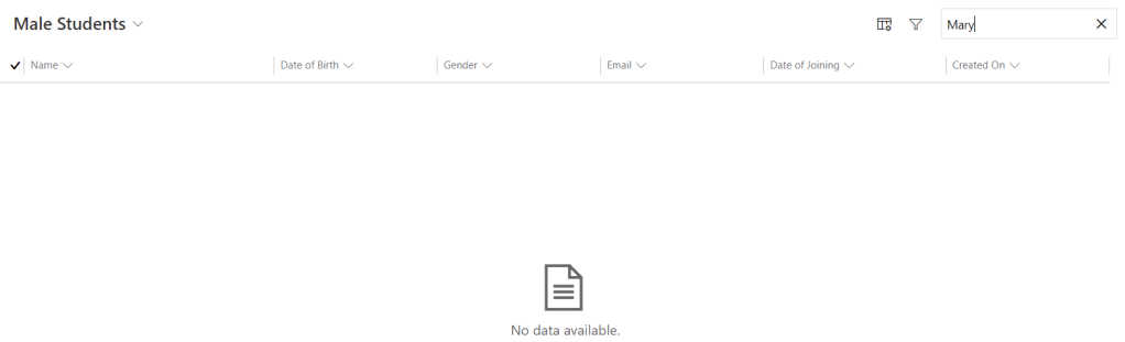 - As an example, If I search for a ‘Female’ record while a ‘Male Students’ view selected, no records would be fetched. This is because of the search confined to the selected ‘Male Students’ view.