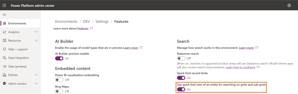 - To enable ‘Traditional’ Quick Find, from the Admin Center, select the Environment, go to Settings -> Features and turn on the “Use quick find view of an entity for searching on grids and sub-grids” setting.