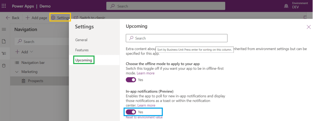 - In the App Editor, select ‘Settings -> Upcoming’ and enable the In-app notifications (Preview) as below.