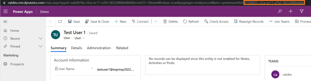 - Next copy the ‘Test User 1’ GUID by opening the User from ‘Advanced Find’. We will use this GUID while creating notification.