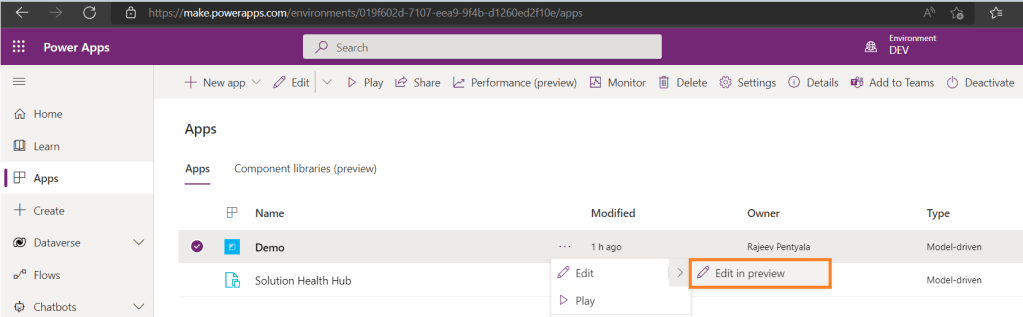- Open the ‘Model Driven App’ using ‘Edit in preview’ option.