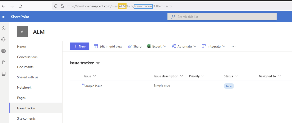 - Create a SharePoint site if not exists already and add a list using native ‘Issue Tracker’ template (You can also use any List of your choice).