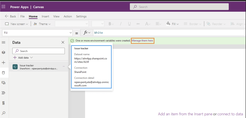 - Once you add the ‘SharePoint’ data source, you would notice a banner message, indicates Environment Variables were auto created.