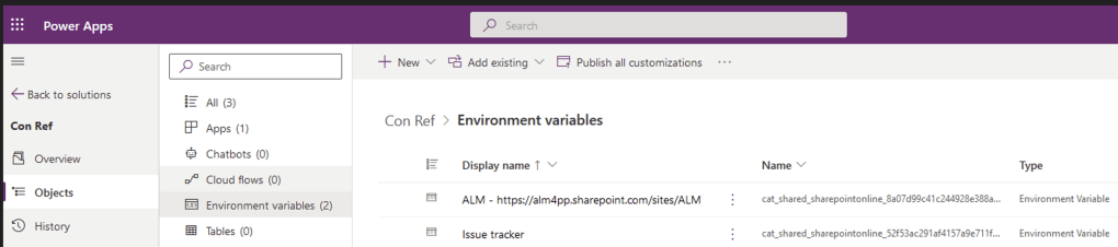- Click on the ‘Manage them here’ will redirect you to the Solution where you can access the auto created ‘Environment Variables’.