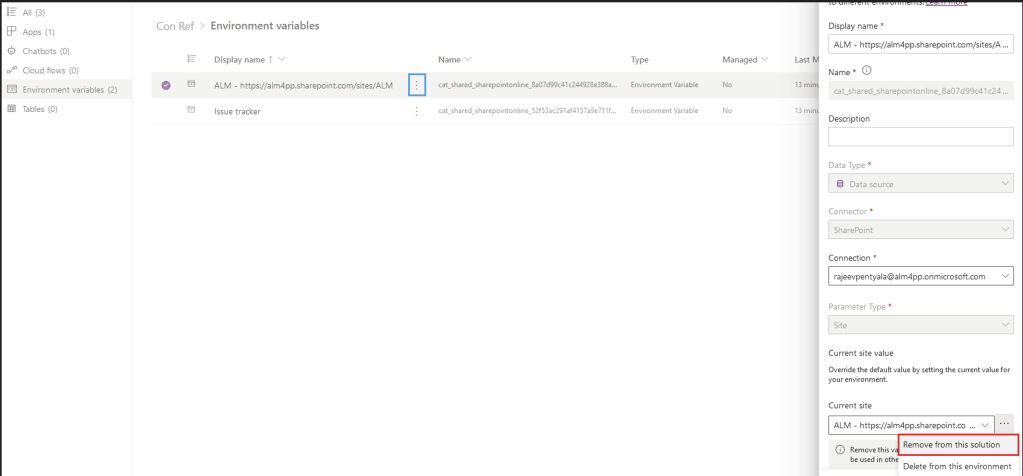 - You would not get above Connection reference and Environment Variables panes, if you have not chosen the ‘Remove from this solution‘ option.