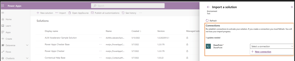 - When the ‘Canvas App’ moved to QA and Production environments using Solution import, it must connect to the ‘QA’ and ‘Prod’ SharePoint sites.