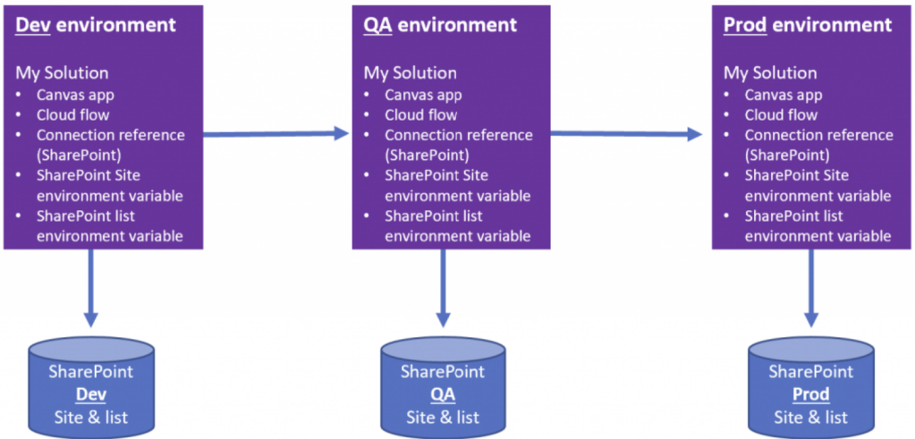 - SharePoint team got 3 Sites (i.e., Dev/QA/Prod) and they also use 3 different Power Platform environments for Development, QA, and Production.