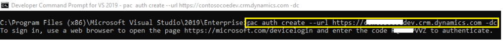 pac auth create --url https://{your environment}.crm.dynamics.com -dc