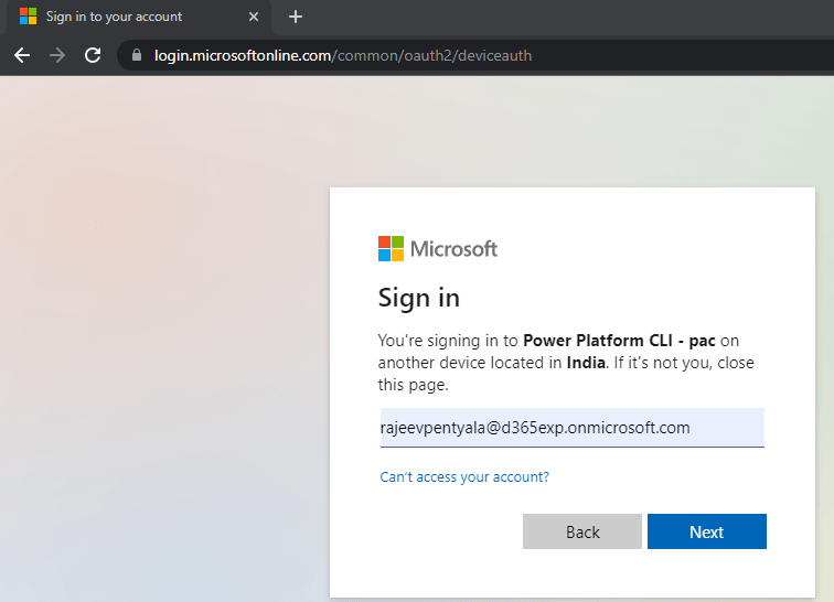 - Now you can close the browser and good to start executing pac cli commands from console.