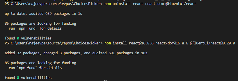 npm install react@16.8.6 react-dom@16.8.6 @fluentui/react@8.29.0
