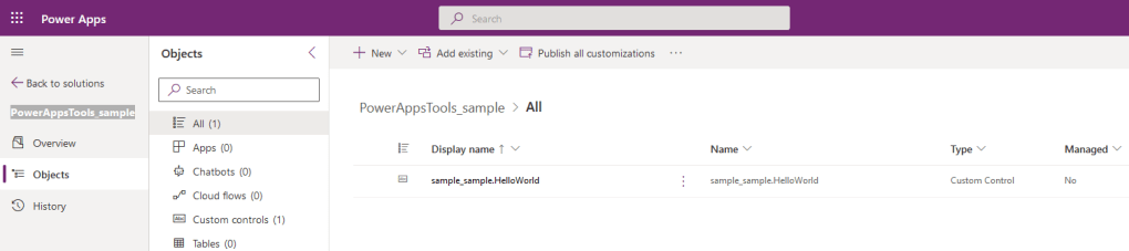 - In my case, a new solution “PowerAppsTools_sample” got created, as I mentioned the Publisher Prefix name as sample.