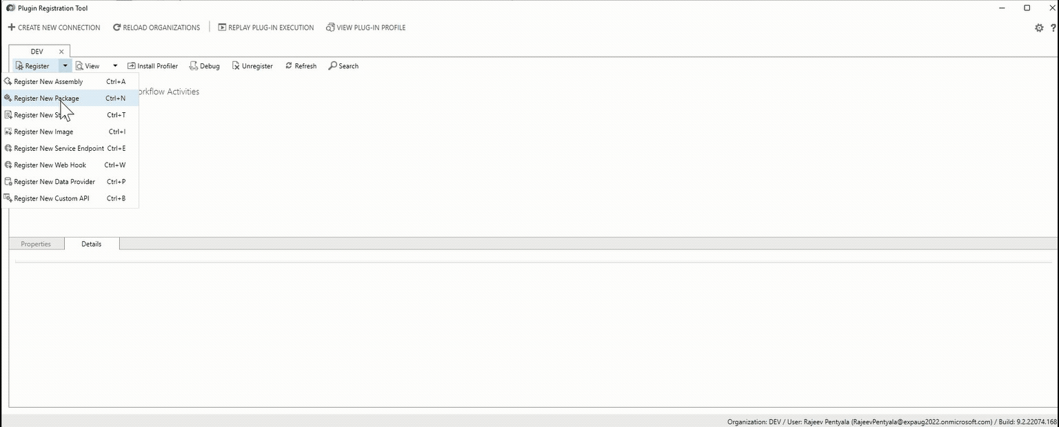 - Use ‘Register New Package’ and map the .nupkg file which will be available under your plug-in project bin\debug folder.