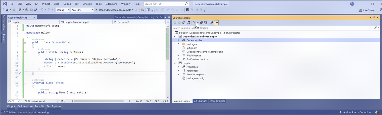 In scenario 1, we have seen how to use ‘Newtonsoft.Json.dll’ in the same plug-in assembly project. In scenario 2, lets see how to use another project.