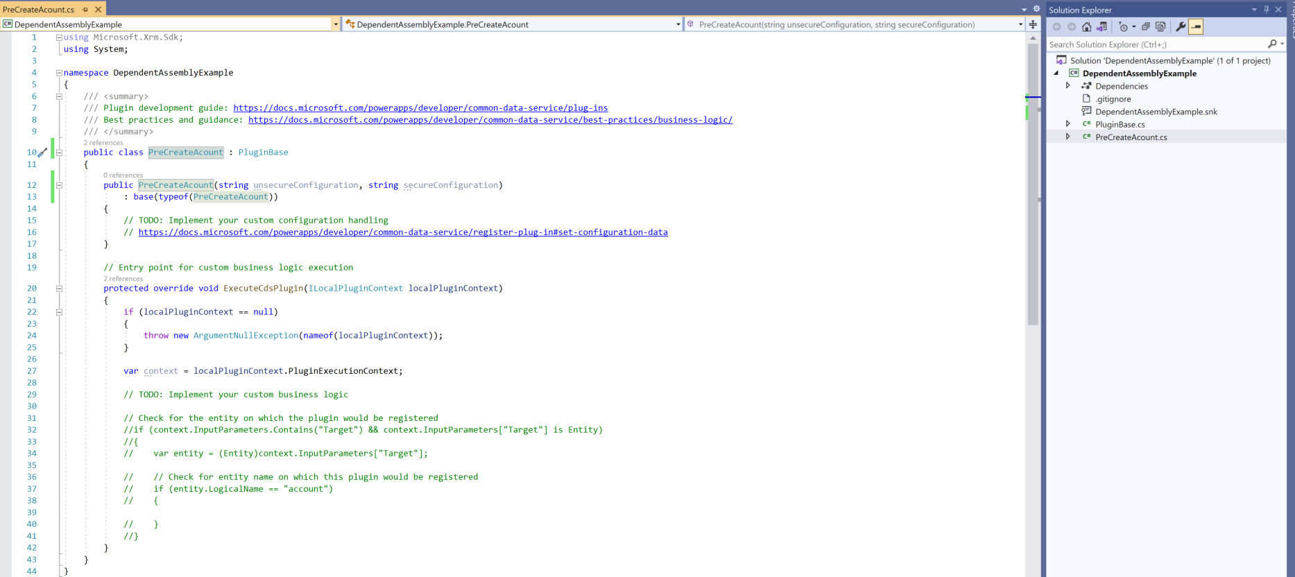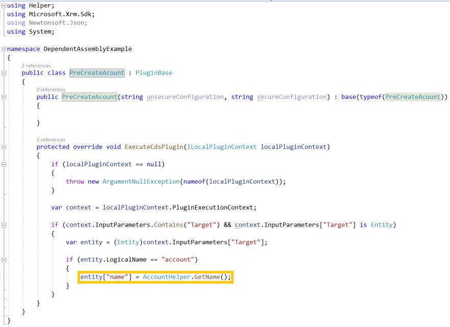 - In the ‘PreCreateAcount.cs’ plugin class, call the AccountHelper.GetName()