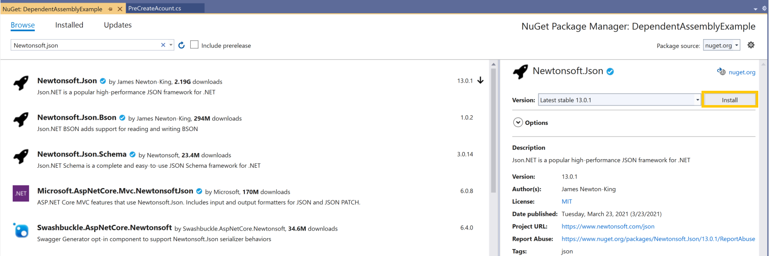 - Add the following code snippet which uses JsonConvert.DeserializeObject method of NewtonSoft to “PreCreateAcount.cs” file