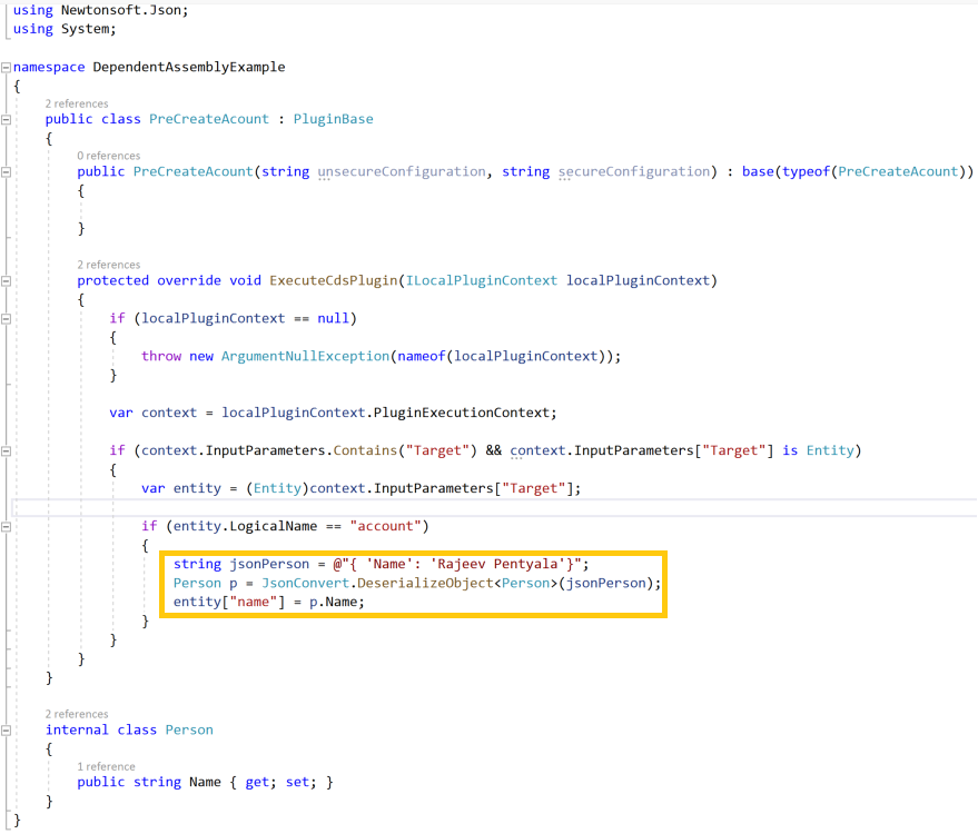 Lets see how easily ‘Newtonsoft.Json.dll’ can be used in our plug-in project. The scenario I am using is on pre create off Account, I am setting ‘Name’ field by parsing json string.