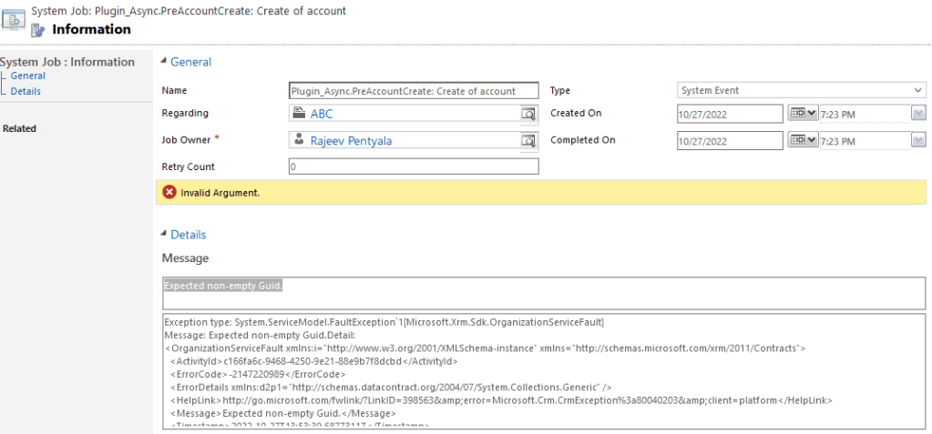 - Since its ‘Asynchronous’ plugin, checked ‘System Job’ which failed with “Expected non-empty Guid” exception.