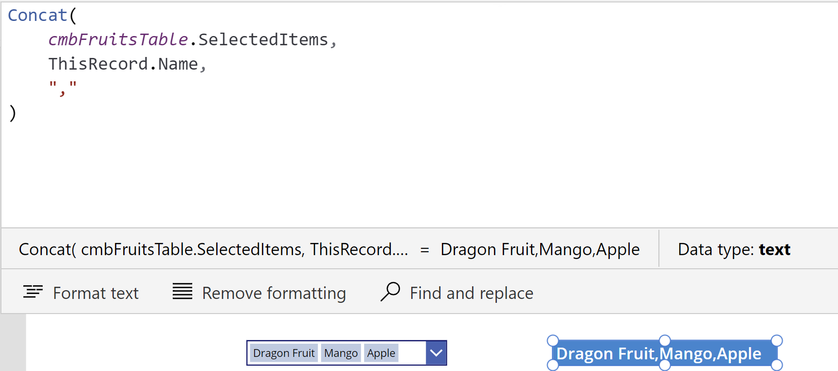 - Formula : Concat(cmbFruitsTable.SelectedItems,ThisRecord.Name,”,”)